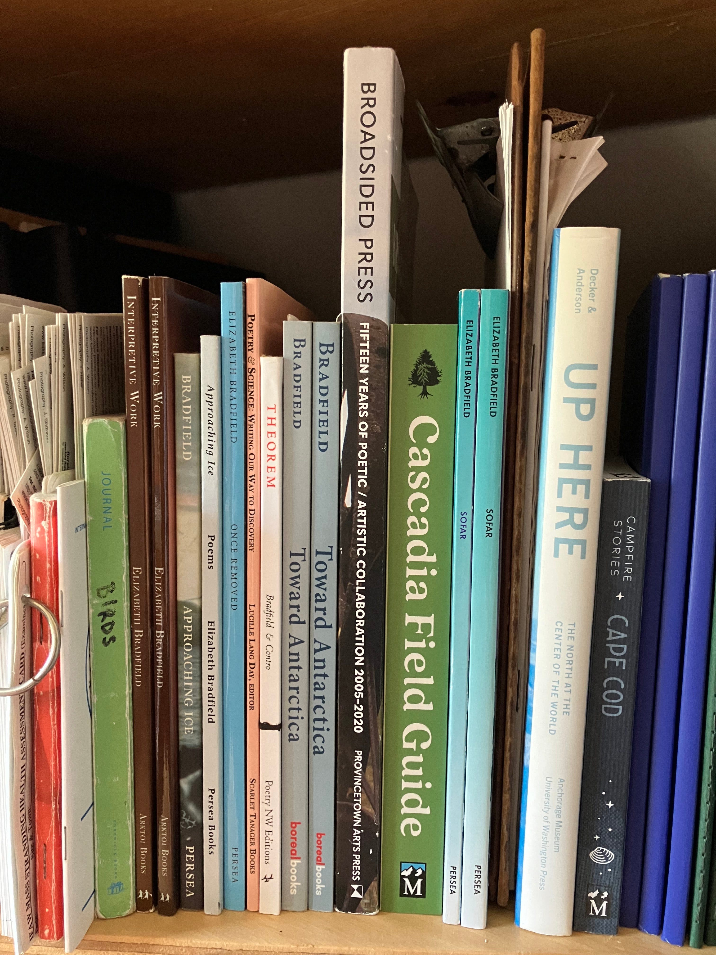 Writer/naturalist ELIZABETH BRADFIELD’S most recent books are Toward Antarctica, Theorem, and Cascadia Field Guide: Art, Ecology, Poetry. Her poems have appeared in The New Yorker, Atlantic Monthly, Poetry, The Sun, and her honors include the Audre Lorde Prize in Lesbian Poetry, a Massachusetts Cultural Council grant, and a Stegner Fellowship. For the past twenty-some years, Liz has worked as a naturalist and field assistant at home on Cape Cod as well as on small ships around the globe. She teaches creative writing at Brandeis University and is editor-in-chief of Broadsided.