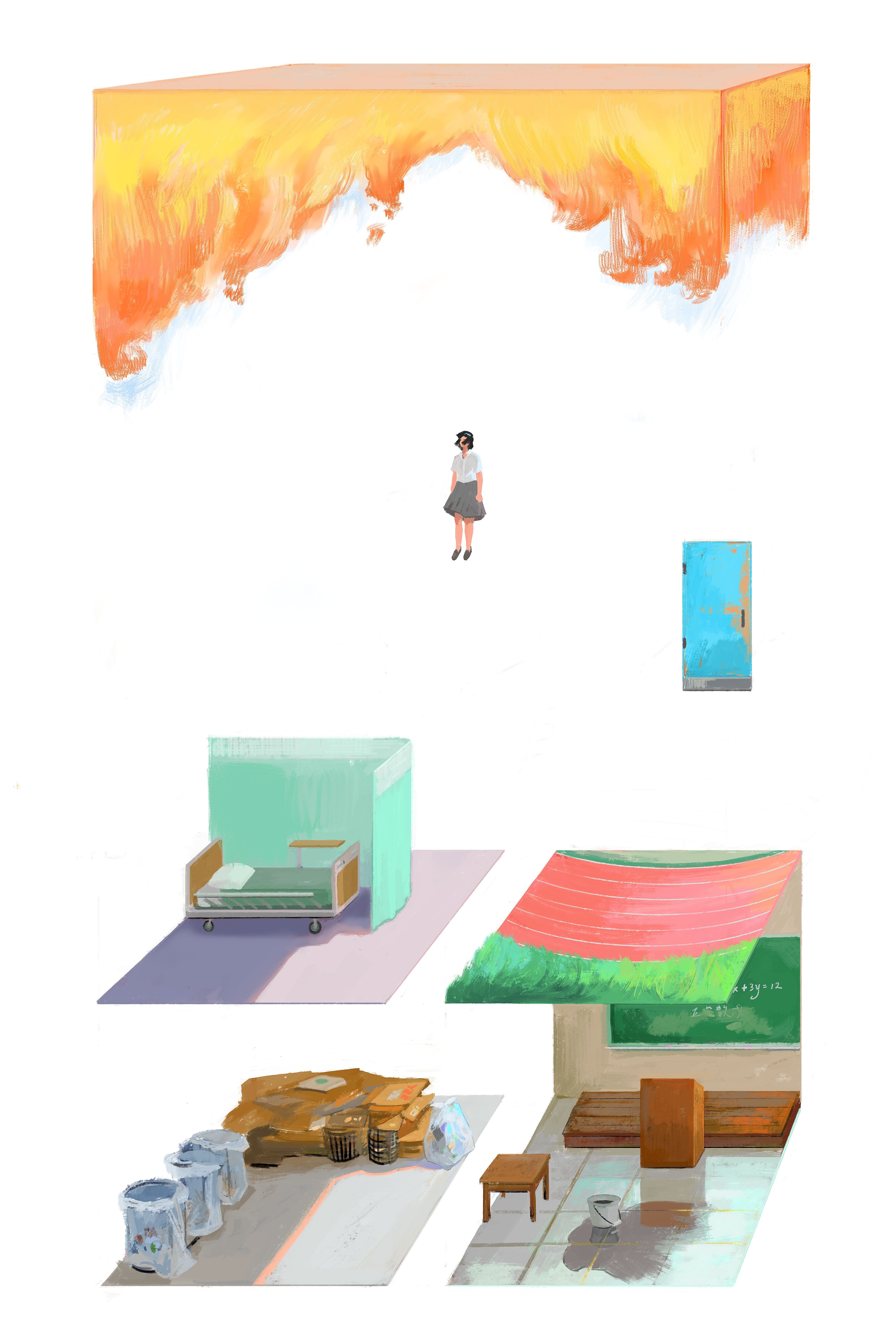 In my piece, I drew from my own experiences living through the Taiwanese education system. I still remember the vulnerability, susceptibility, and frustration of youth, and how much difference was resented and suppressed. I was interested in exploring this collective “we”: who belongs in it? Who gets to belong in it? How does it start to unravel?