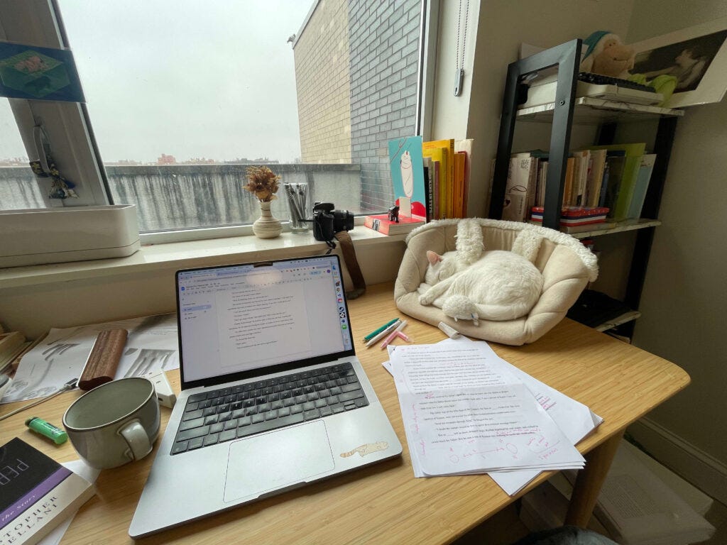 I like making edits on paper. Printed stories are spatial stories; I could better see their structure and move things around. Whenever I begin to feel too precious about my words, I change the text to a different font; it helps me get unstuck.