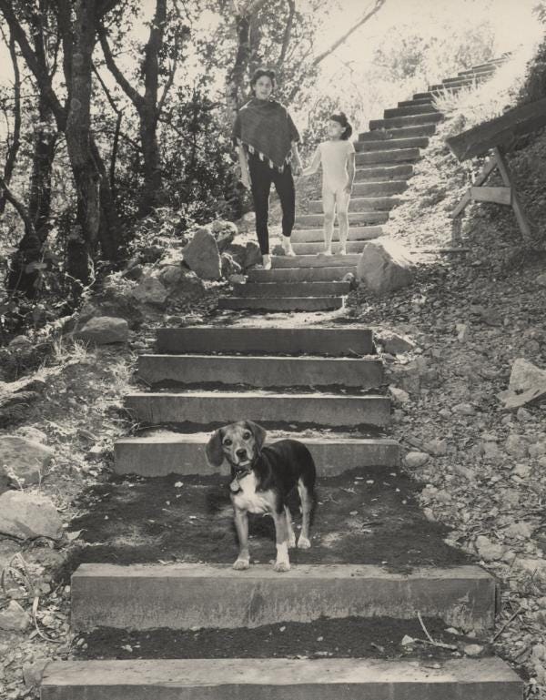 The presence of this staircase, and its several companion stairways crisscrossing the Halprin property, set in motion subtle yet persistent movement patterns for Anna as a dancer that rippled through her life as a choreographer. Walking on stairs presents a unique test for maintaining dynamic balance. Steps present uncertain challenges to gait because one is always actively balancing. Absorbing the gait disturbance of level changes forces a repeated shift from standing to walking to stabilizing. It involves careful placement of the individual foot in these three dimensions. Effectively the body is unstable in the static sense at all times when walking stairs as it shifts between foot placement and actively rebalancing, and this rhythm undergirds Anna’s work. Stairs demand an immediate attention to the body’s position in space and a physical alertness to its proximate environment. This continual and close dynamic between the objects in our lives and ourselves parallels that between ourselves and the physical forms we inhabit—which Pierre Bourdieu theorized as a facet of habitus, the way the containers of our lives contour our actions in the world outside. The fact that Anna was a dancer interacting with the stairs of an architect and landscape designer so intimately, intensified the impact of domestic space and its objects on her and imparted a unique legibility of the repercussions on her dance work. Like a cyclical ripple effect, the dances she would create as a consequence offered lessons and models of physical responses to designed objects that would return to influence Larry’s own methods of urban design.